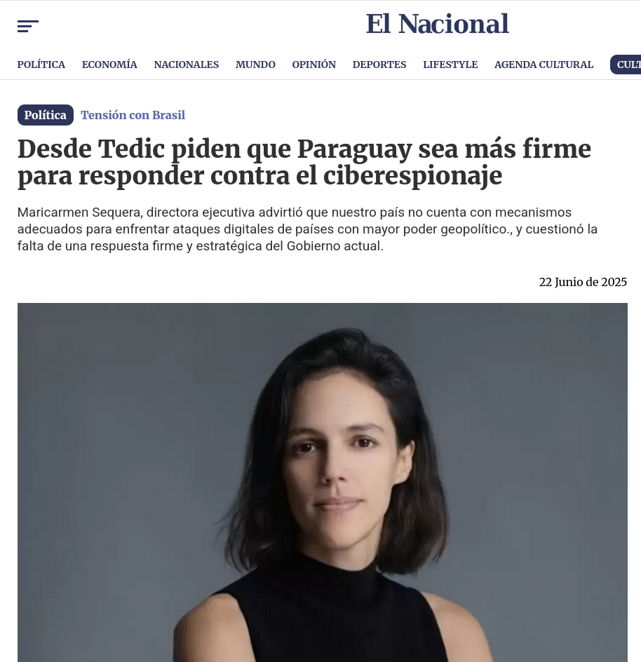 Interviews and mentions in this area focused on security gaps, data breaches, protection of digital infrastructure, and practices of individual and collective digital care for human rights defenders. TEDIC was consulted as a reference to translate complex technical issues into accessible terms, emphasizing that digital security is not only a technological issue, but also a political and social one.