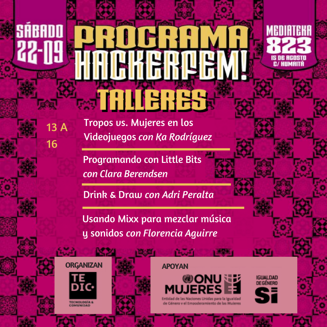 Este 22 de setiembre en la Mediateca (15 de agosto 823 casi Humaitá) celebramos nuestra presencia como mujeres, amor, dominio y liberación haciendo uso de la tecnología desde diversos sectores. Te invitamos a que seas parte de la Hackerfem 2018, un encuentro y una fiesta para compartir en comunidad sobre lo que hacemos, y sobre cómo difundir, apropiarnos, empoderarnos y celebrar nuestras habilidades tecnológicas y cyborg. Habrá de todo: Muestra de proyectos, arte, robótica, videojuegos, mixing de música, moda, ¡y mucho más!