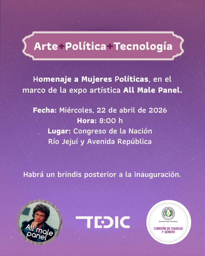 Desde TEDIC, junto con la Comisión de Equidad y Género del Congreso Nacional, invitamos a participar de la muestra artística All Male Panel, una exposición que busca visibilizar la ausencia de las mujeres en los espacios de poder y decisión, además de rendir homenaje a mujeres políticas y referentes de la sociedad civil por su trayectoria en la construcción de sociedades más justas e igualitarias. La actividad se realizará el miércoles 22 de abril, a las 08:00, en el Hall central del Congreso Nacional (Av. Stella Maris casi Río Ypané).
